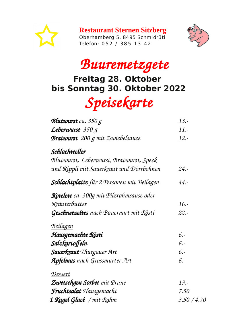 - Schlachtteller Blutwurst, Leberwurst, Bratwurst, Speckund Rippli mit Sauerkraut und Dörrbohnen 🌟 24.- CHF